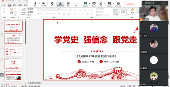 分团委组织部于12月13日至12月25日组织学院50余个团支部,在1100余名青年学生中开展了以“学习二十大,永远跟党走,奋进新征程”为主题的团日活动,广泛组织团员青年学习宣传贯彻会议精神,在全院产生热烈反响。