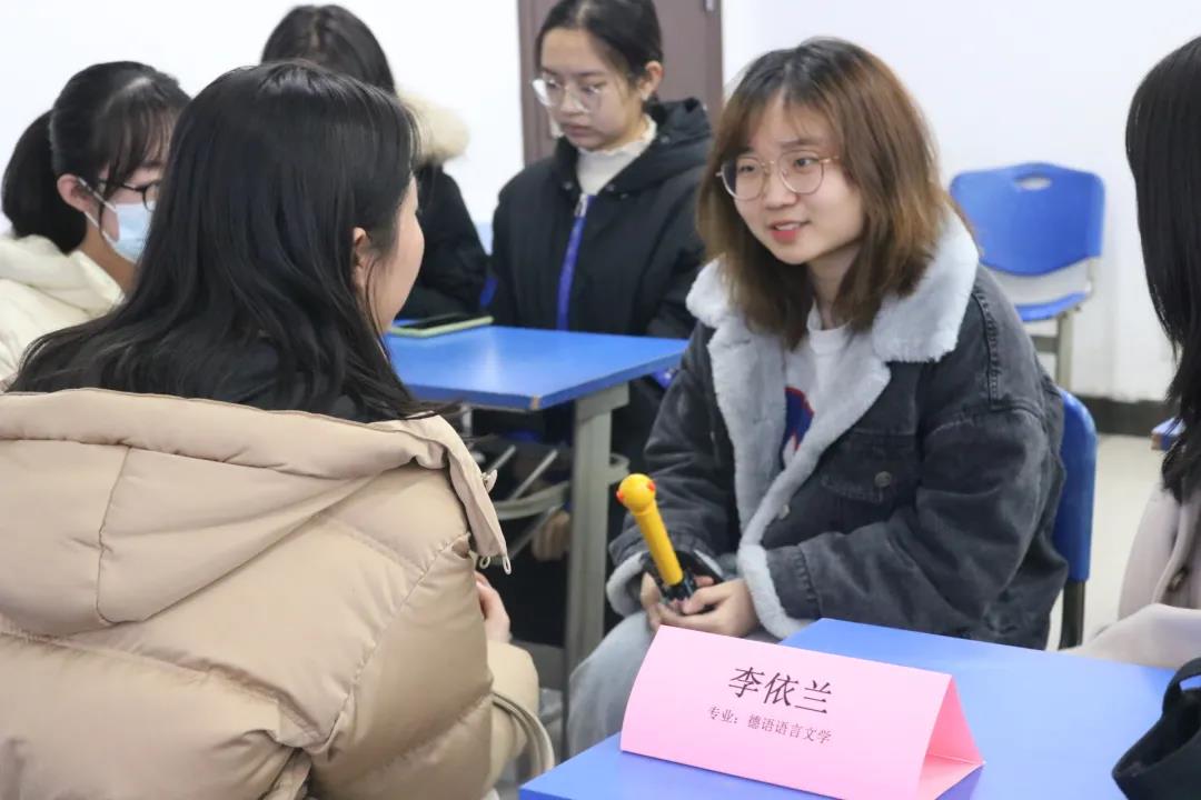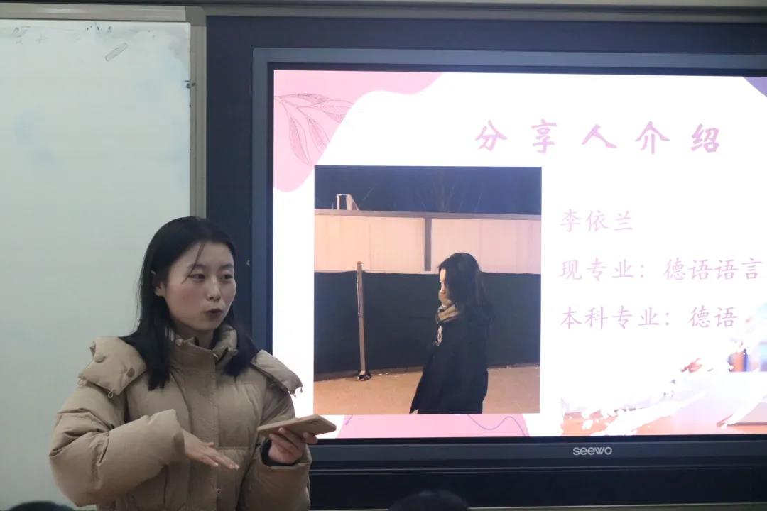 德语语言文学文学方向的李依兰着重分享了在专业课考试中基础德语和综合德语的备考,她提醒同学们复习时应提前计划,按时完成,同时反复复习和总结做过的翻译题。另外,她用自己的考试经验,提醒同学们:应注意把握时间和答题纸的空间,学会调整自己的状态,不要紧张。