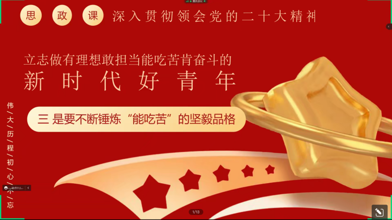 全体硕士研究生讲授了一节以《深入学习领会党的二十大精神, 立志做有理想、敢担当、能吃苦、肯奋斗的新时代好青年》为主题的思政课,并从以下四个方面深入讲解。
