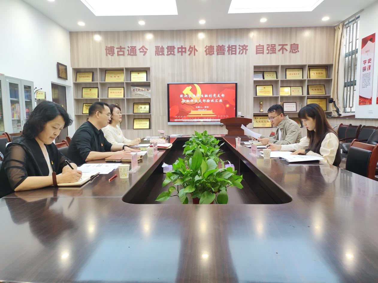 师生融创党支部于2022年9月23日下午14:30在教学楼G区109会议室接受了校级样板支部评估验收。英文学院党委副书记马文静、党务秘书杨雪芬受学校党委委派前来验收,学院党委副书记郭富庭、纪彩玲,师生融创党支部书记游洁,党务秘书杨雨聪参加了验收评估会。会议由郭富庭主持。