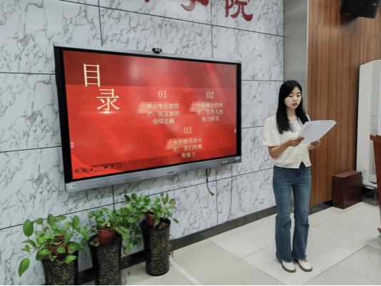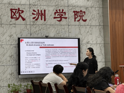 教工第二支部支委陈琛以“绿染山河美 梦筑中国新”为主题,用葡萄牙语+中文两种语言讲述了党和国家深刻践行绿色发展理念的生动实践,阐述了黄土高原是如何秉承绿色发展理念,成功实现了由从前的黄土漫天到今天的绿意盎然。