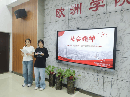 师生融创支部支委梁渝晨和孙悦颜通过剖析延安精神,结合德语的专业知识,辩证地分析了“四风”问题反弹的风险,并援引优秀共产党员张思德的先进事迹,号召大家用中国共产党人的精神谱系滋养初心。