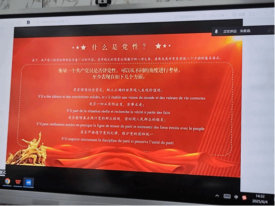 研究生第二支部支委宋晨涵以“锤炼党性 提高觉悟”为题,用中法两种语言讲述了什么是党性、把握党性内涵的时代要求以及如何锻造坚强党性。
