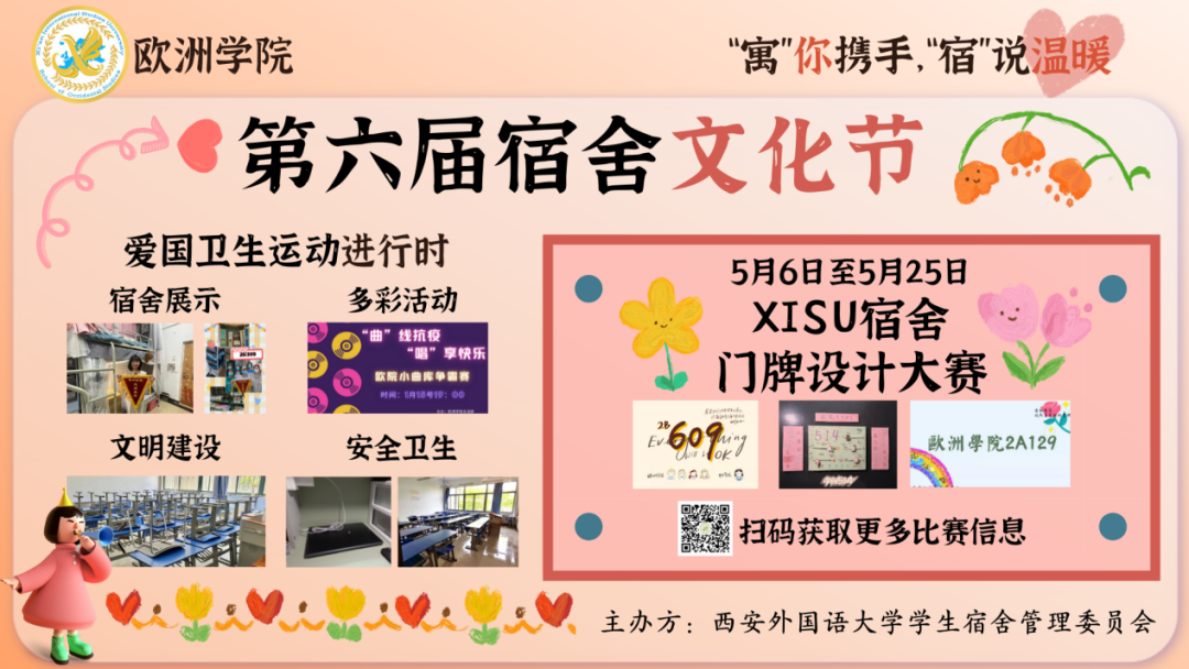 本活动旨在激发同学们创作灵感,结合宿舍人物特点、专业知识等元素,采用手绘、电脑制图等技术,以宿舍为单位设计具有本宿舍特色的宿舍门牌,以线上投票的形式评选出优秀作品并给予奖励。