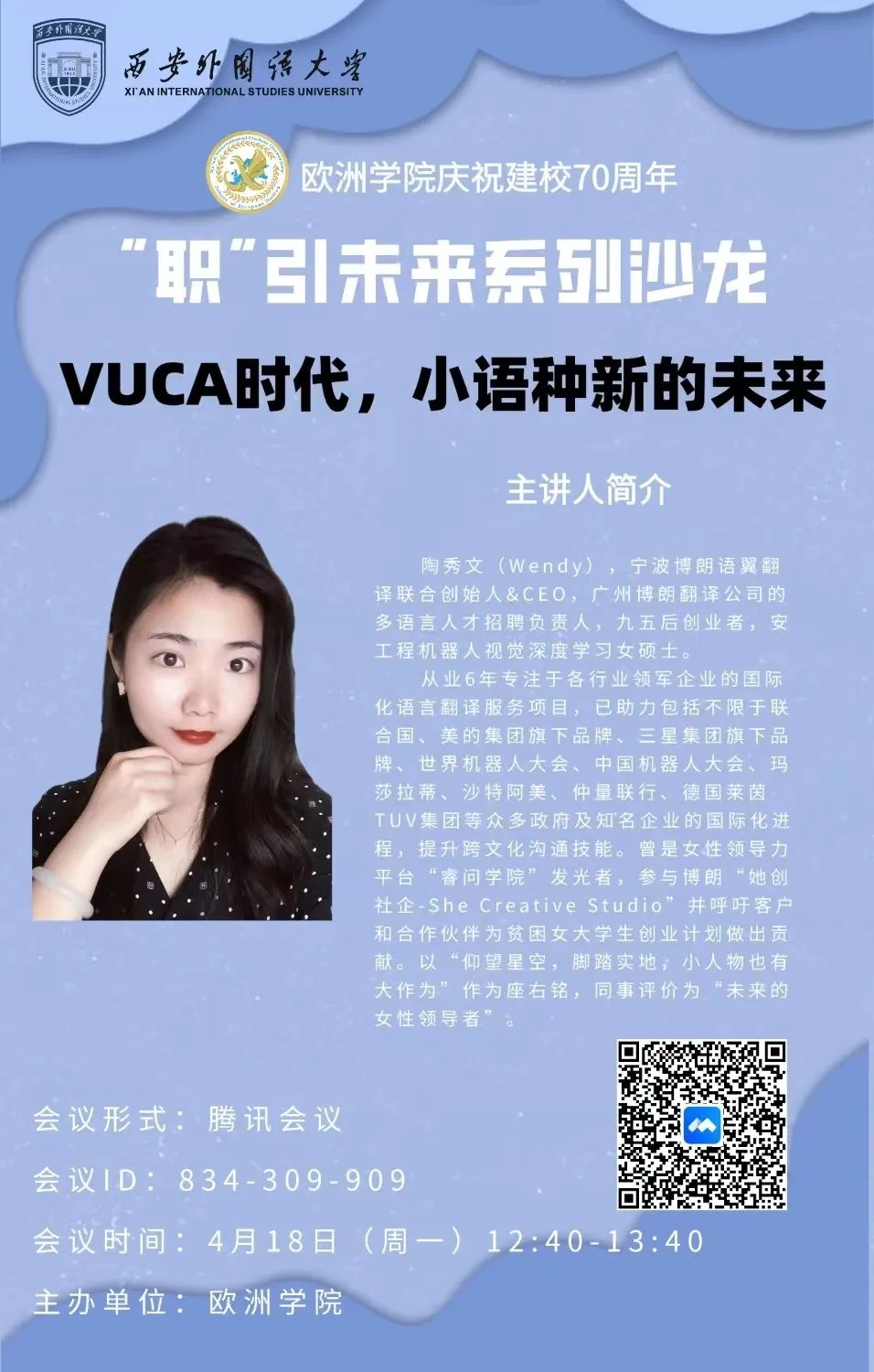 为庆祝建校70周年,澳门娱乐官网 分团委·学生会实践部承办“职”引未来系列沙龙,我们邀请到了陶秀文老师给大家带来“VUCA时代,小语种新的未来”讲座,诚邀同学们参与。参与形式为腾讯会议,详细参会信息见海报↓