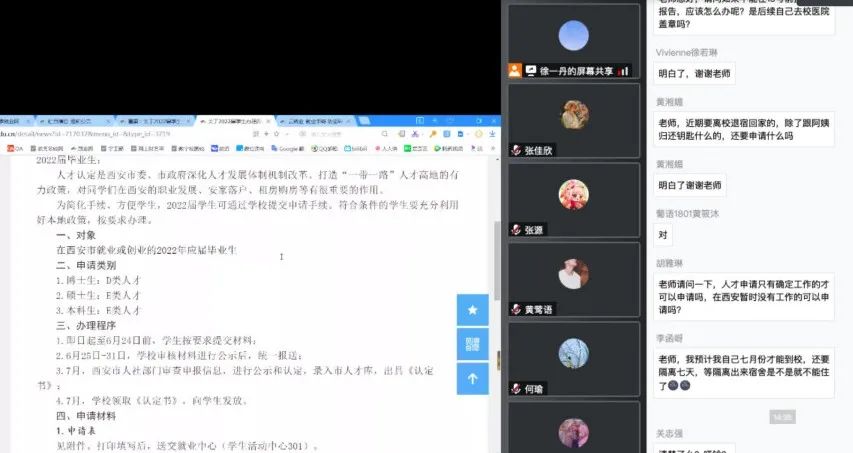 接着,关于毕业体检的上交以及学信网的照片确认事宜,徐一丹再次进行叮嘱,告知具体做法。随后针对西安市D、E类人才分类认定申请表以及学校下发的“关于2022届学生毕业去向材料的提示”两个通知对同学们进行逐字讲解,传达相关内容,认真介绍就业协议书、用人单位出具的接收函、劳动合同、工作证明、录取通知书等不同类别的去向落实材料,告知同学们每类材料针对的情况,鼓励同学们积极落实毕业去向。