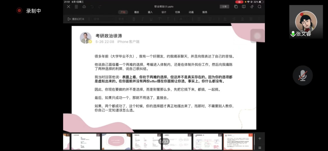 张文睿的分享侧重于小语种跨专业考研。她主要分享了如何在大三大四之际作出适合自己的选择、如何选择院校、备考等等,在精神上鼓舞了大家,跨专业考研实属不易,学姐也让同学们尽量减少跨考的焦虑,学会从当下慢慢找准目标开始努力。
