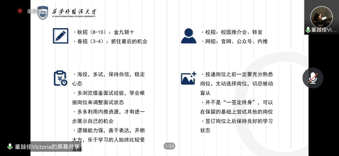 董越佳向我们主要介绍了如何制作完善自己的简历以及如何获得一份满意的工作。她着重强调了个人综合能力的提升,这有利于同学们在接下来的大学生活中重新审视自己,抓住机会投资自己,为以后就业做充足的准备。