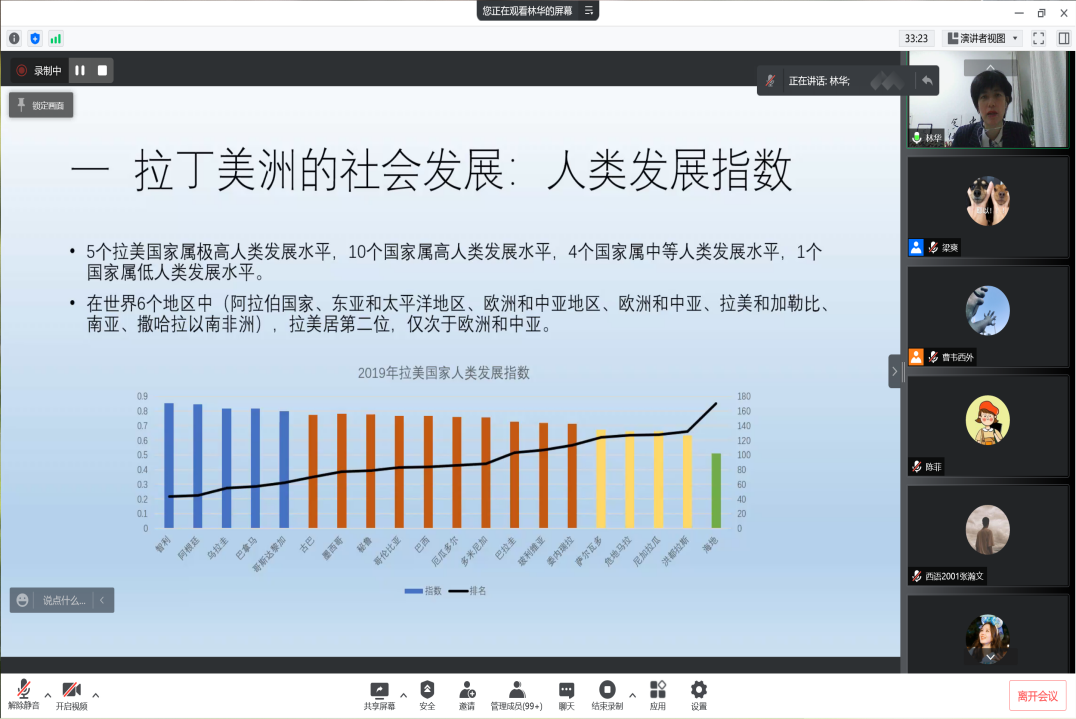 在讲座中,林华研究员从人类发展指数引入主题。在世界地区排名中,拉美位居第二位,仅次于欧洲和中亚,人类发展指数较高。但拉美社会呈现出了发展不平等、贫富差距较大等严峻的社会问题。