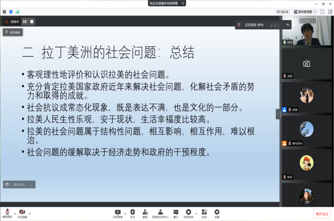 之后,林华研究员梳理了本次讲座的主要内容。讲座以拉丁美洲为研究对象,从社会发展水平、社会问题及新冠疫情对拉丁美洲的冲击三个方面展开介绍,旨在引导大家客观地认识拉丁美洲,思考拉丁美洲的发展问题。
