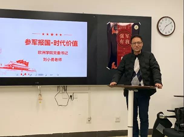 党委书记刘小勇老师为同学们讲解了大时代背景下参军报国与家国情怀。刘老师首先从个人成长经历出发介绍了本人对于军队军营的深厚感情,并重点强调了“携笔从戎,保家卫国”时代价值,他指出,如今的和平年代是老一辈人用鲜血换来的,当今大学生要勇于扛起保家卫国、守护和平的责任,携笔从戎、矢志军营、献身国防,积极投身到强军伟业当中,用自己的专业知识为实现中国梦、强军梦贡献青春力量。最后,刘老师指出本次活动不仅仅是一次主题班会,也是澳门娱乐