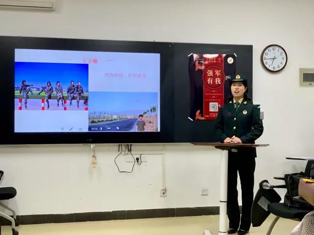 王子暾同学以《因为相信,所以看见》为题作入伍分享,王子暾2019年考入西安外国语大学旅游学院,同年九月参军入伍,曾服役于中国人民解放军火箭军某部。由于爷爷是曾经是一名解放军,耳濡目染下当兵也成了王子暾从小的梦想。关于军旅青春教给她的第一课便是当兵不是为了吃苦,但是当兵一定要吃得起苦。“在军营的每一天,无论多辛苦,那都是有意义的!”这两年的军营生活,给王子暾带来了巨大的精神宝藏。介绍女兵时,王子暾骄傲地介绍到随着时代和武器装备的发展,部队越来越需要女生的细致,现在女兵已经越来越靠近战场的中央,在火箭军有“女子导弹发射连”,在黎以边境有女兵扫雷分队,在陆军还有女子坦克驾驶员,巾帼不让须眉的迷彩绿已经是不可辩驳的现实。