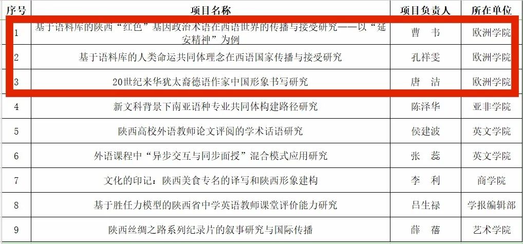 其中澳门娱乐 3个项目获批立项,分别为“基于语料库的陕西‘红色’基因政治术语在西语世界的传播与接受研究——以延安精神为例”“基于语料库的人类命运共同体理念在西语国家传播与接受研究”“20世纪来华犹太裔德语作家中国形象书写研究”。具体名单如下。
