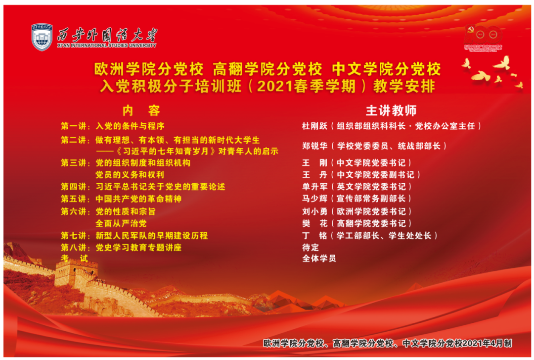 、高翻学院及中文学院联合举办入党积极分子培训班开班式暨第一讲课程。中文学院党委书记王刚、副书记王丹、高翻学院党委书记樊花、澳门娱乐官网
