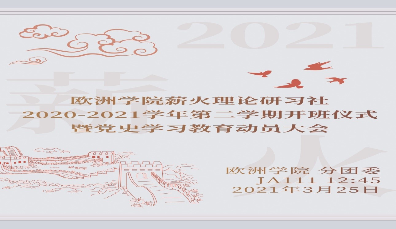 “薪火”理论研习社2020-2021年度第二学期开班仪式暨党史学习教育动员会于JA111召开,校党委委员、副校长赵国华、校团委书记王娜、院党委书记刘小勇、“薪火”指导教师梁鹿儿、部分学生党支部书记以及全体社员参加了此次会议。赵国华对大学生开展党史学习教育进行了动员,“薪火”理论研习社社长张雨晨同学主持会议。