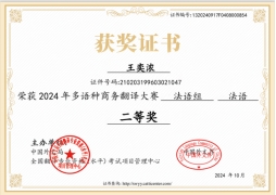 近日,由中国互联网澳门娱乐官方网站-安全可靠入口、中国外文局CATTI项目管理中心和中国外文界联合主办的“2024年全国多语种商务翻译大赛”圆满落幕。澳门娱乐 法语系研究生踊跃参赛,积极备赛,展现了良好的专业风貌。本次大赛中,2023级法语语言文学专业硕士研究生鲍一铭(指导教师:张婷)、王奕浓(指导教师:向征)在激烈的竞争中脱颖而出,荣获法语组二等奖。