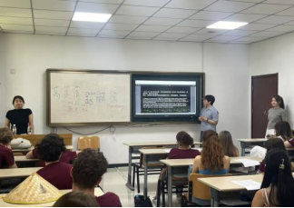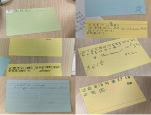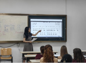 4月28日下午,一场别开生面的中文歌曲教学课有序展开。法语系学生赵鹏涛、蒲志妍和高美倩提前制作了歌词卡,通过分步骤教学,引导法国学生逐句学唱经典儿歌《虫儿飞》。教学过程中,法语系学生采用“先示范后跟唱”的模式,先由中方学生完整演唱歌曲,随后将歌词拆解为短句,配合手势辅助法国学生理解“虫儿”“繁星”等意象的汉语发音及含义。活动接近尾声时,蒲志妍用吉他伴奏,全体学生用汉语完整演唱歌曲,并写下感悟。