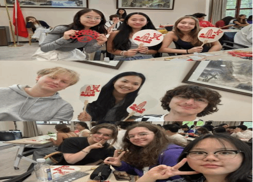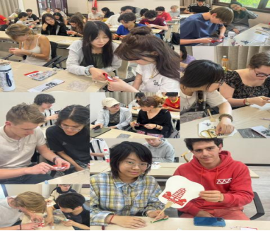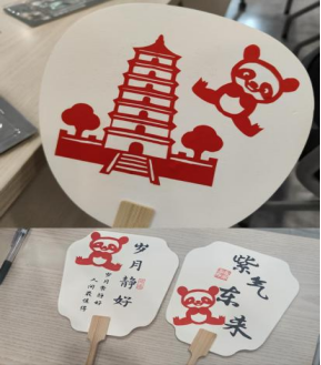 剪纸活动中,同学们尝试了种类丰富、色彩鲜艳的剪纸图片,如喜字窗花、五彩门笺。每幅作品都让大家眼前一亮,陶醉其中。老师们提前准备了写有祝福语的团扇以及大熊猫和大雁塔的模板。同学们分组进行体验,剪纸的过程充满欢声笑语,虽然是第一次参加这样的活动,但法国学生充满热情与活力,当他们将剪好的作品贴在扇面上时都露出会心的笑容。