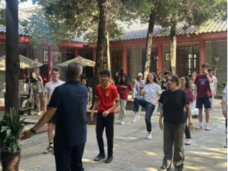学习太极拳时,指导老师为大家示范招式,帮助同学们规范动作,讲解每个招式背后的文化底蕴,在孔子像下,在一呼一吸之间,在手起掌落之时,中华传统文化之美沁入每位同学心间。