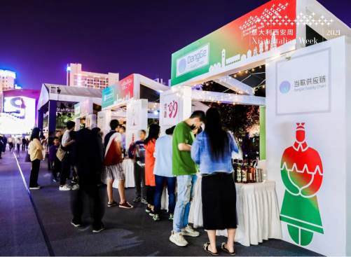 在现场人气最高的的要属中意露天集市了。由数十家国际知名食品集团携21家中意品牌商户搭建的意式特色集市,包含了中意特色美食、皮具、手工艺品以及轻奢鞋服等:如意大利的百年体育超级IP“环意“Giro d’Italia”、豪华汽车品牌玛莎拉蒂(Maserati)、意大利传统手工冰淇淋VORO、皇室御用咖啡豆品牌Costadoro、意大利国宝级美妆品牌 WiQo、威尼托古典庄园里的尚品干红—Amarone阿玛罗尼;亦不乏西安本土品牌——陕拾叁、泾阳茯砖茶,以及西安唯一拥有意大利传统熔岩石窑炉的意大利餐厅——南瓜花。