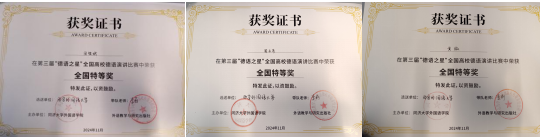 2024年11月3日,由同济大学外国语学院、外语教学与研究出版社主办,同济大学外国语学院德语系承办,教育部首批虚拟教研室“德语本科专业教研室”协办,中国德国友好协会指导的第三届“德语之星”全国高校德语演讲比赛决赛在同济大学举行。澳门娱乐 选派的由2023级本科生黄微、田祺燃、2024级本科生周天宇组成的代表队入围决赛,并最终荣获全国特等奖。