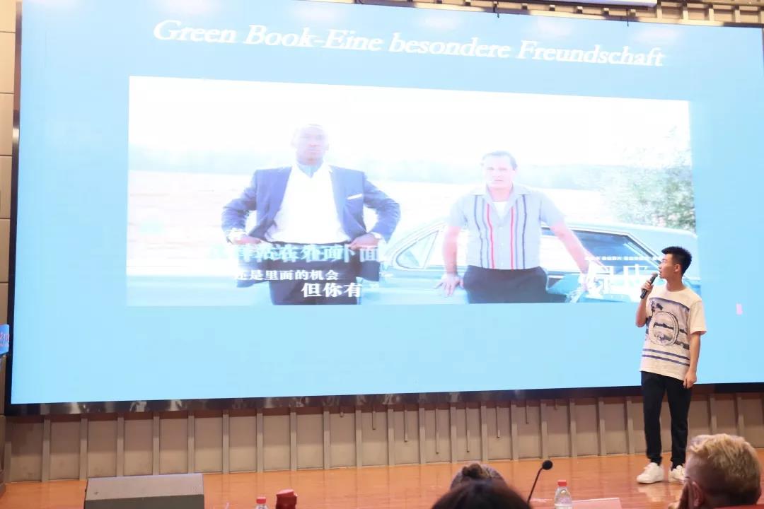 第十三位上场的是来自安连德语的林泽昊,他同样为大家介绍了自己最喜爱的电影《Grünes Buch》(《绿皮书》)。它讲述了一位黑人音乐家和白人司机,在种族歧视成为常态的那个时代,成为情比金坚的朋友的故事。