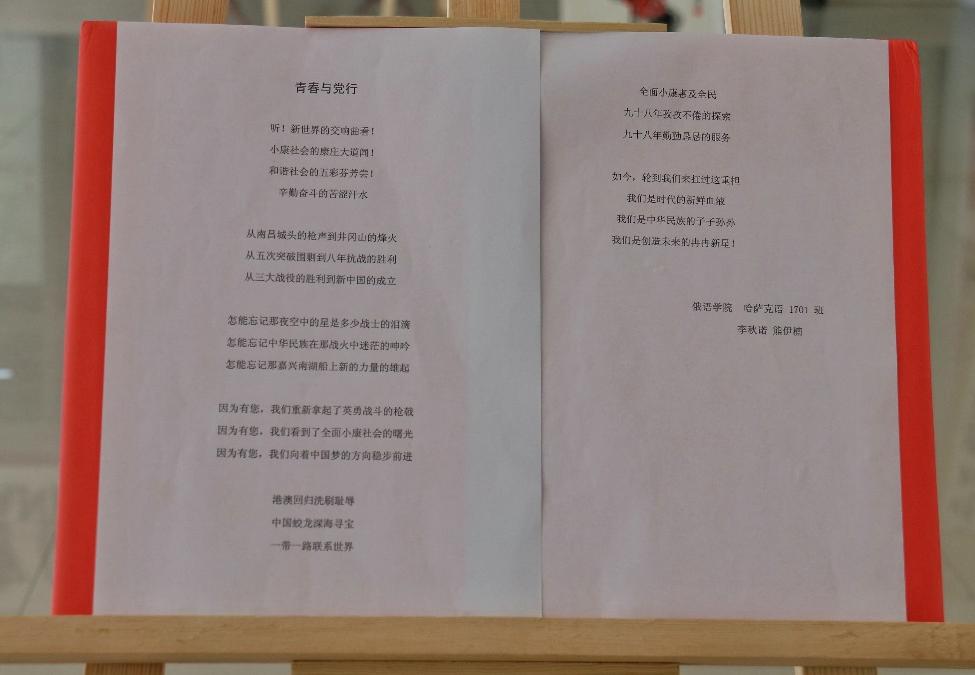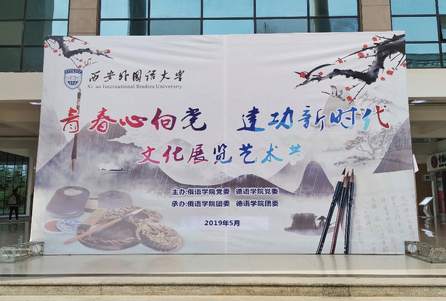 在中华人民共和国成立70周年、五四运动100周年之际,为激励和引导广大学生紧握新时代主旋律,弘扬五四精神,坚定文化自信,正确认识责任使命,5月9日至5月14日,德语学院党委与俄语学院党委共同举办“青春心向党•建功新时代”文化展览艺术节活动。