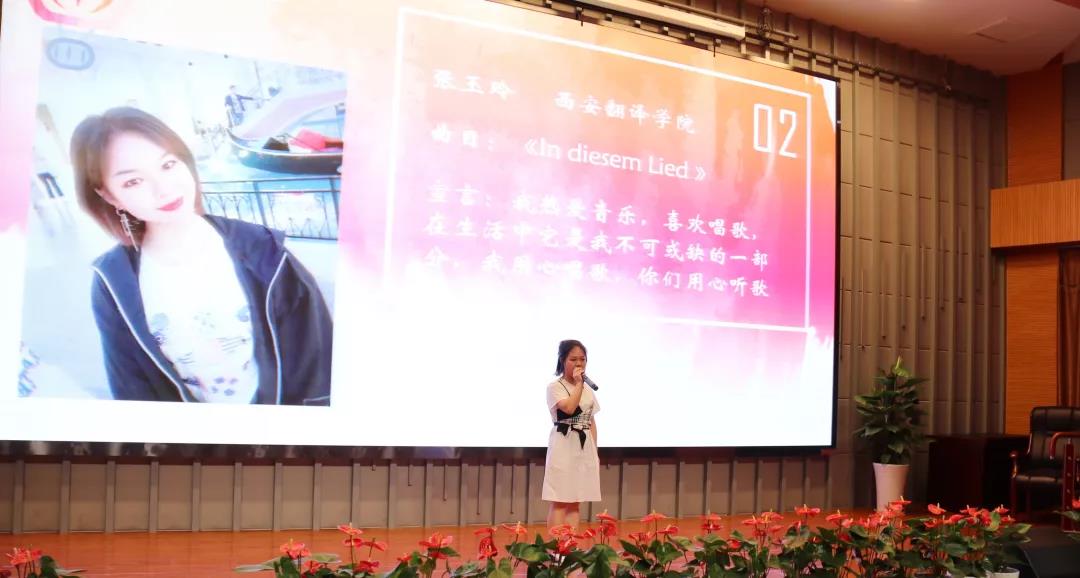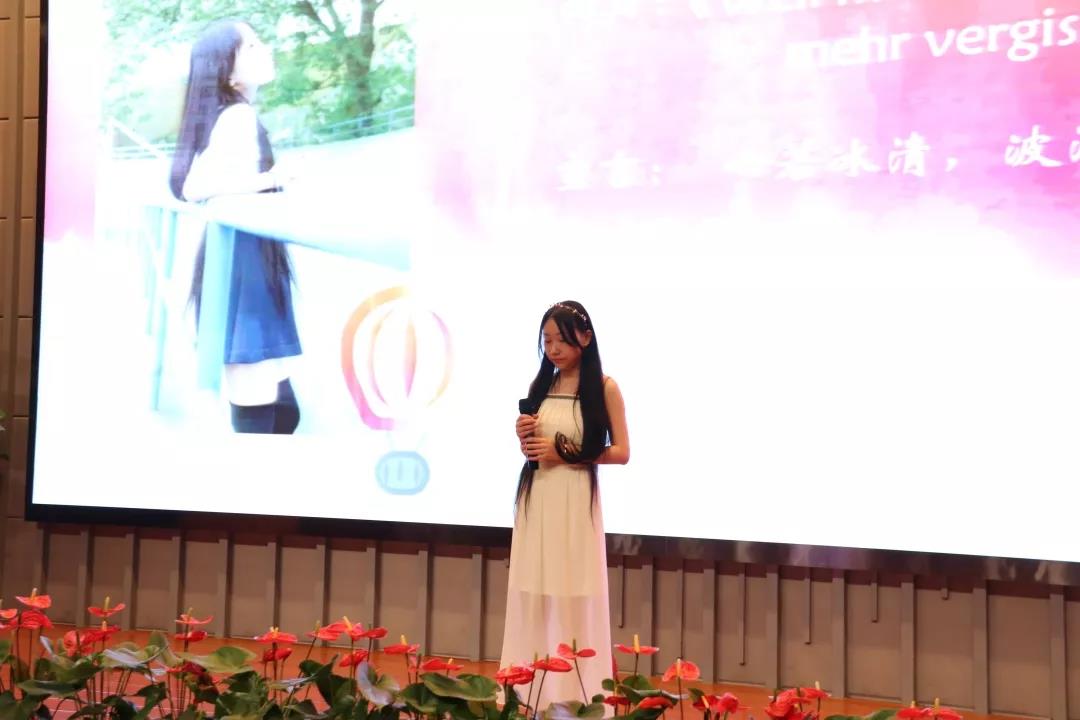 第六位带来表演的是来自西安外国语大学的耿诗涵,她深情演唱了一首著名英文歌曲的德语版——《Weil mein Herz dich nie mehr vergisst》。