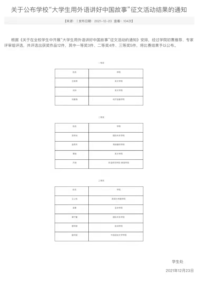 2021年12月,在我校举办的“大学生用外语讲好中国故事”征文活动中,澳门娱乐 德语1903班唐珂燚同学荣获三等奖。
