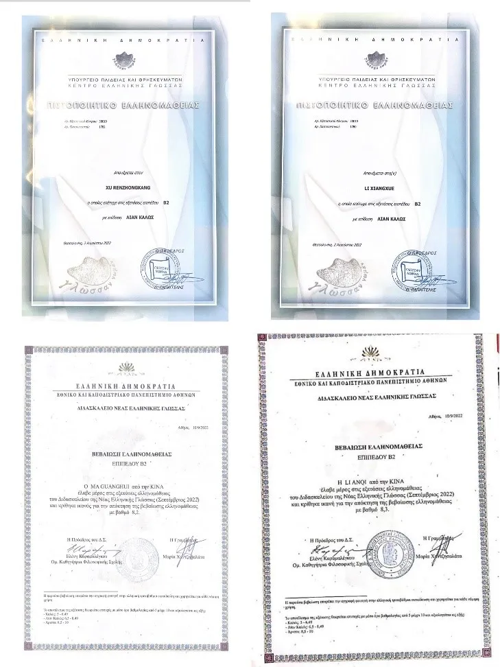 右下为学生在希腊交换期间考取希腊语B2等级证书