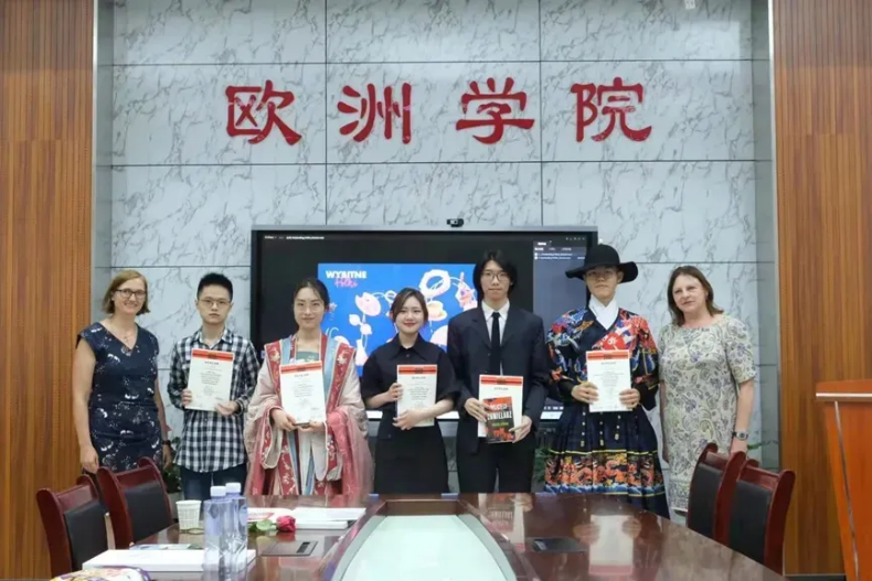 与使馆教育处主任嬴茉晏女士(最左)为波兰语专业学生颁奖赠书